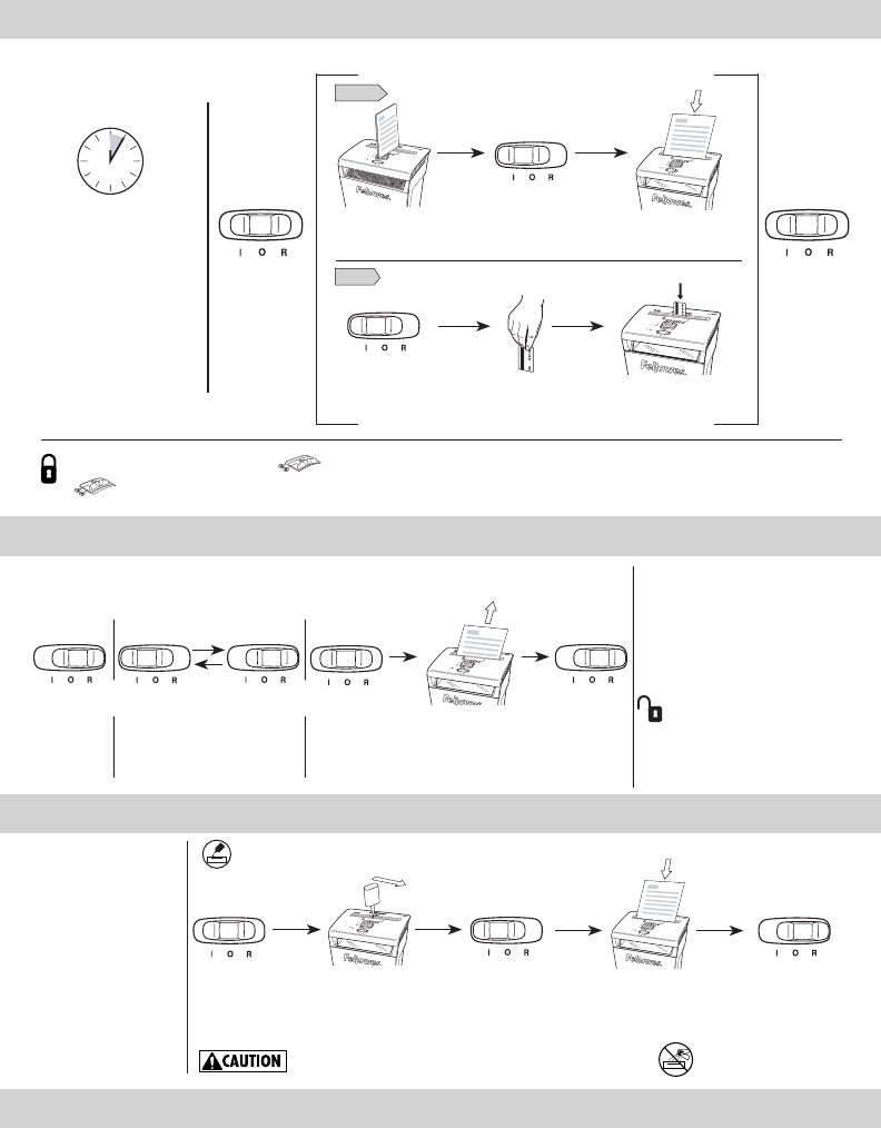 Paper jam: Set to Off (O), remove shredder head and empty bin. Replace shredder head, and follow any or