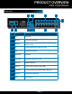 PRODUCT OVERVIEW DVR CONTROLS Front Panel 3 1 Item Function 2 Control 4 5 6 7 9 8 10 11 12 14 13 16 15 18 17 19 21 20 Description 1 2 (1) IR remote receiver Power indicator light 3 Previous file/1 4 HDD indicator light 5 Next file /2 6 PTZ /8 7 8 Slow play /3 HDD Info/9 Direct remote towards this position when using DVR A red light indicates power is on In Live Mode shows camera One; In search and Playback mode: selects previous file in list;Use to select previous entry