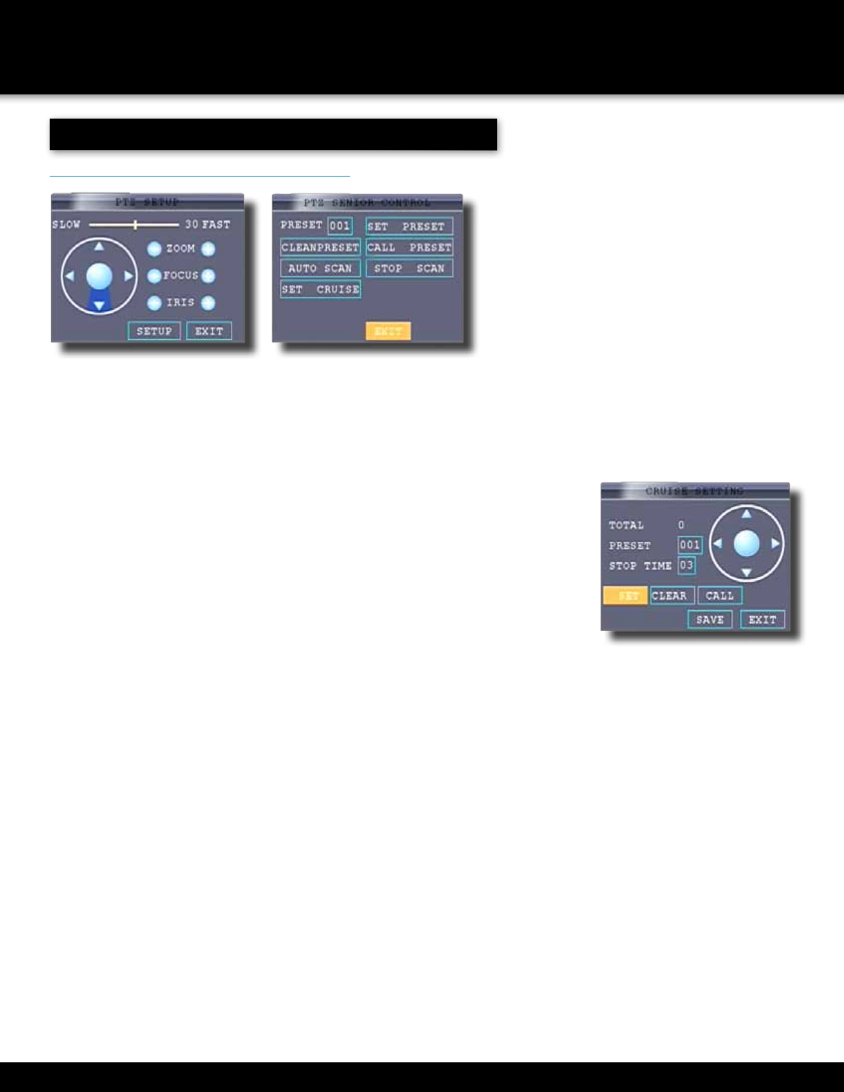 Click SETUP from the PTZ SETUP screen and you will see the PTZ SENIOR CONTROL