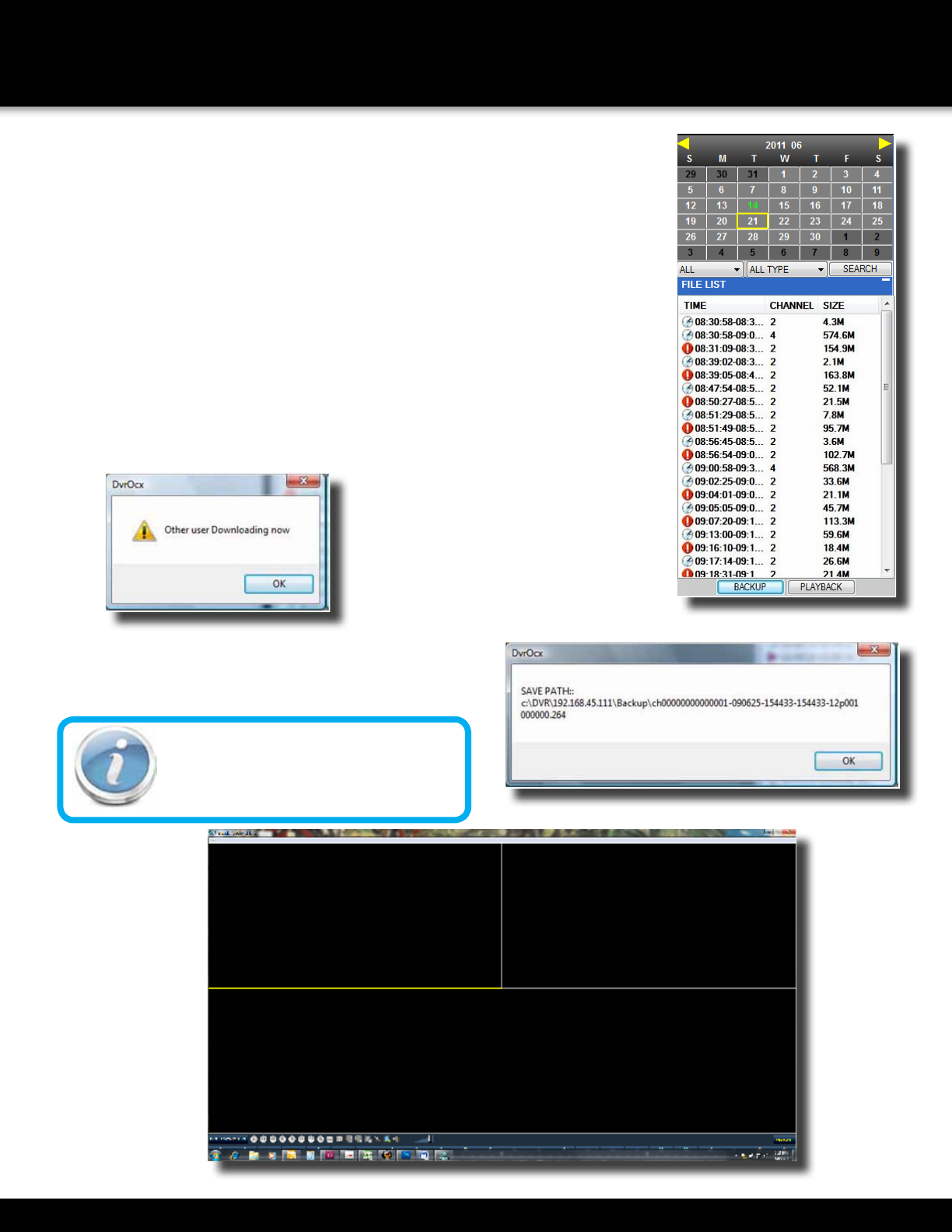 3. Click BACKUP. Backup begins to C:/DVR/[ip_address]/Backup NOTE: If you