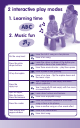 Stir Soup Bowl Flip Napkin Twist Salt and Pepper Shakers Press Pizza Shapes Press Cookies Press Banana Spin Apple Slide Berries Press Sippy Cup MODE SWITCH 4 • Locate the mode switch on the top of the toy. • Slide the mode switch to either learning mode , music mode or off . • When your child is finished playing with this toy, slide the mode switch to the off position. Visit www.fisher-price.