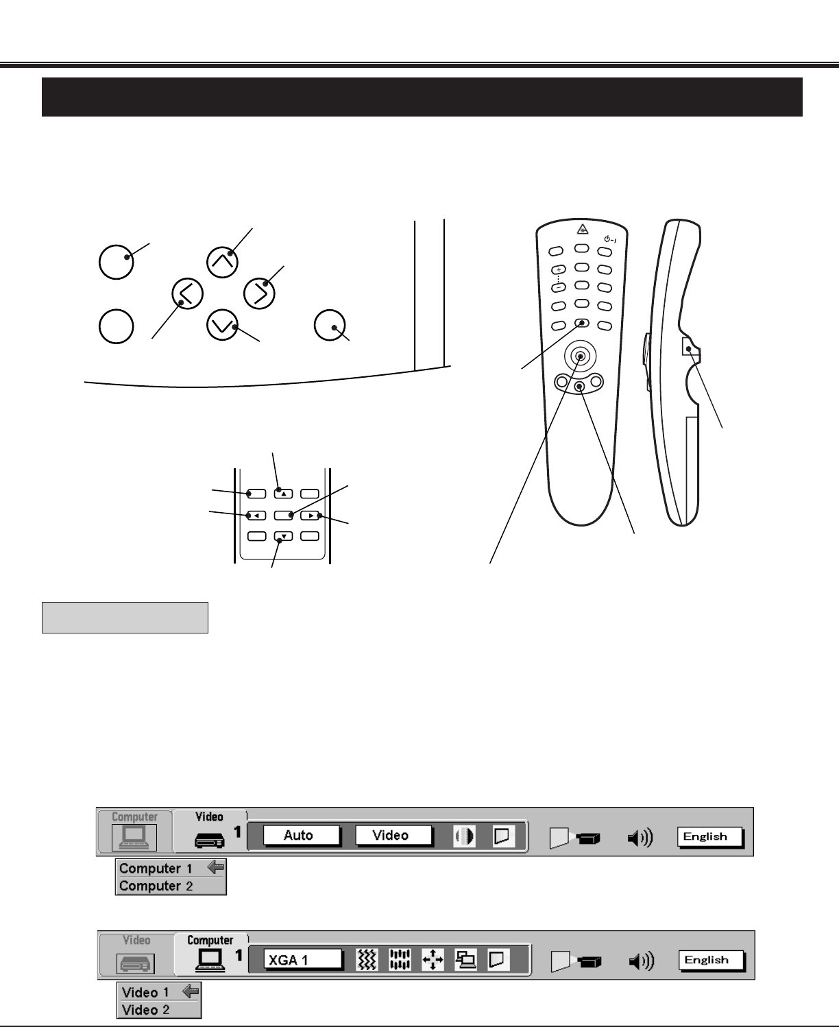 You can select a mode from MAIN MENU display among computer 1, computer 2, video 1, video 2.