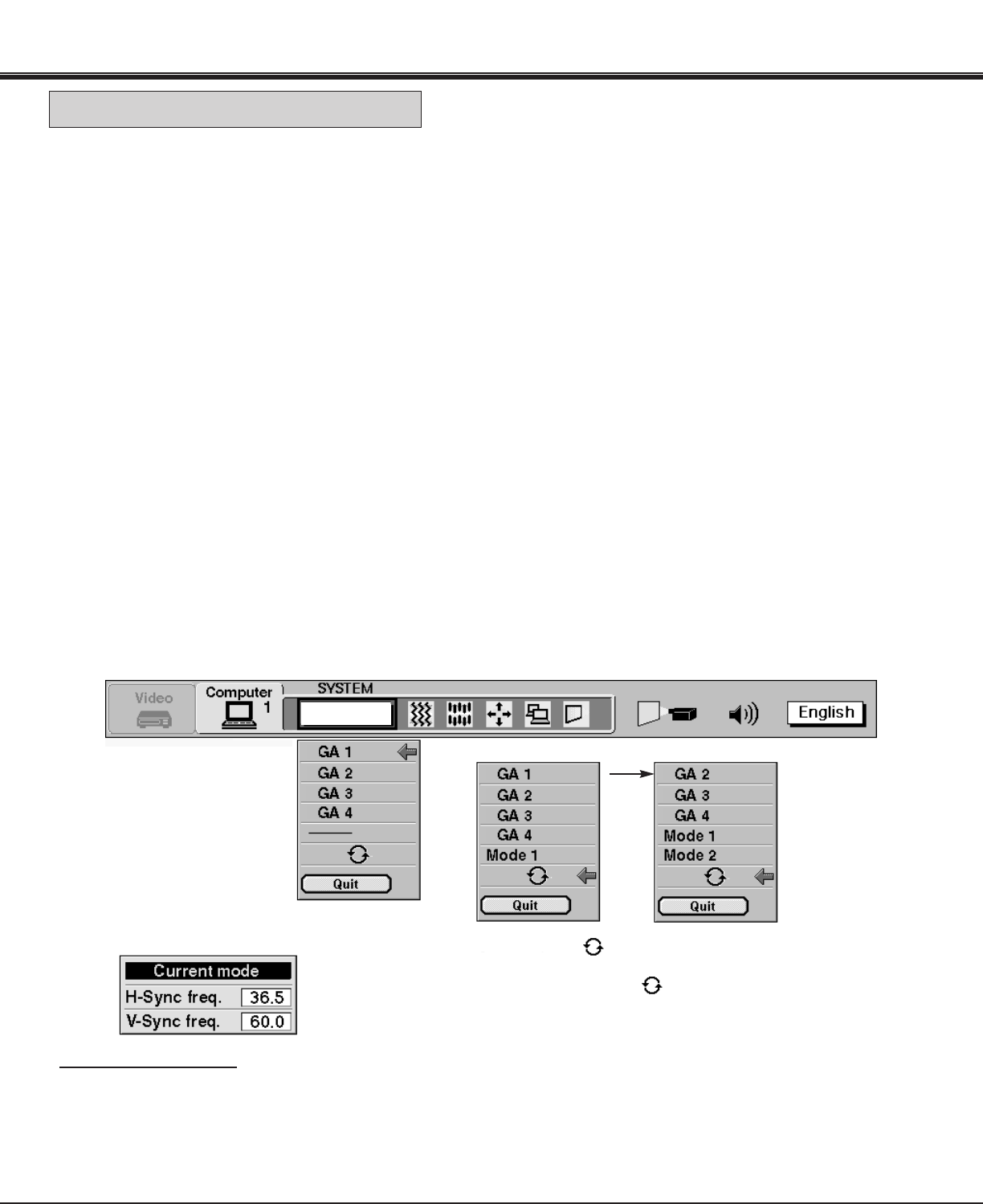 2. Set MODE SELECT to "COMPUTER MODE (1 or 2)". This shows the current display mode initially detected by the