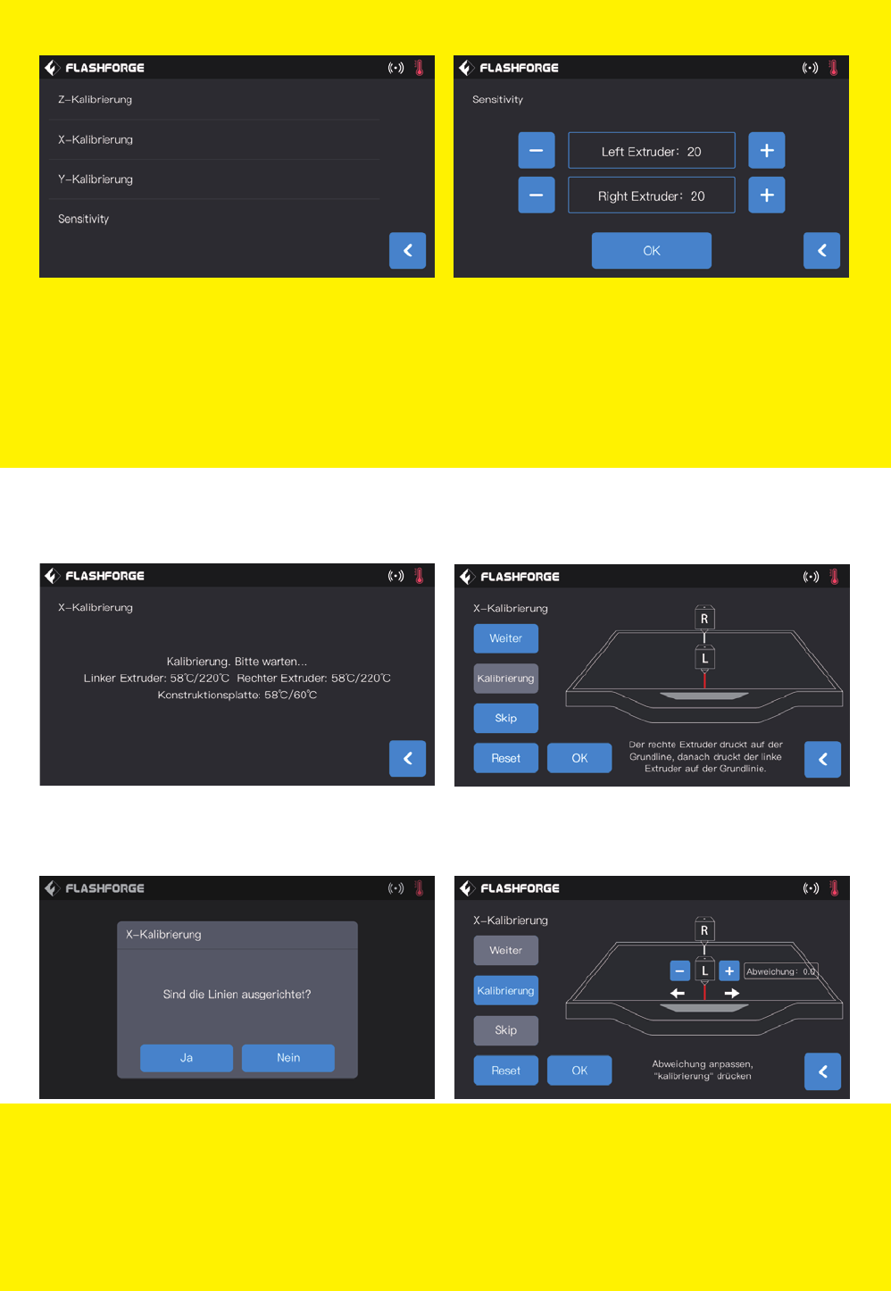 1. Berühren Sie [X-Achsenkalibrierung] und warten Sie bis beide Extruder die gewünschte Temperatur erreicht haben. Beide