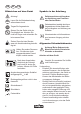 DE AT CH Bildzeichen auf dem Gerät Achtung! Lesen Sie die Betriebsanleitung aufmerksam durch. Tragen Sie Augenschutz. Setzen Sie das Gerät nicht der Feuchtigkeit aus. Arbeiten Sie nicht bei Regen und schneiden Sie kein nasses Gras. Ziehen Sie sofort den Stecker, wenn die Anschlussleitung beschädigt ist. Halten Sie andere Personen fern. Sie könnten durch weggeschleuderte Fremdkörper verletzt werden. Nach dem Ausschalten dreht sich der Schneidkopf noch für einige Sekunden. Hände und Füße fernhalten.