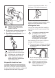 5. Lorsque le récipient est plein d'eau, remettez le filtre en position et videz le récipient. 6. Répétez les étapes 4 et 5 jusqu'à ce que l'eau cesse de s'écouler. 7. Tournez le filtre vers la fauche pour le retirer. 2 1 2. Placez un récipient sous le logement de la pompe de vidange pour recueillir l'eau qui s'écoule. 3. Ouvrez la goulotte vers le bas. Gardez toujours un chiffon à portée de main pour essuyer l'eau qui peut s'écouler lorsque vous retirez le filtre. 1 2 8.