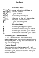 Key Guide Calculator Keys A D Q V X Z (+), S (–), (x), F (÷) - P (%) (+/-) (CONV) (•) Adds, subtracts, multiplies, or divides numbers. Types numbers. Calculates percentages. Changes the sign (+/-) of a number. Displays conversion menu. Types a decimal point. Direction Keys Scrolls right or types a space. Scrolls left or deletes typed letters. Scrolls up or accents typed letters. Scrolls down or accents typed letters.