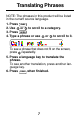 Translating Phrases NOTE: The phrases in this product will be listed in the current source language. 1. Press PHRS . or to scroll to a category. 2. Use 3. Press ENTER . or to scroll to it. 4. Type a phrase or use To see a phrase that does not fit on the screen, press repeatedly. 5. Press a language key to translate the phrase. To see another translation, press another language key. 6. Press CLEAR when finished.