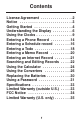 Contents License Agreement . . . . . . . . . . . . . . . .2 Notice . . . . . . . . . . . . . . . . . . . . . . . . . .3 Getting Started . . . . . . . . . . . . . . . . . . .4 Understanding the Display . . . . . . . . . .6 Using the Clocks . . . . . . . . . . . . . . . . . .9 Entering a Phone Record . . . . . . . . . .14 Entering a Schedule record . . . . . . . .16 Entering a Todo . . . . . . . . . . . . . . . . . .18 Entering a Memo Record . . . . . . . . . .20 Entering an Internet Record . . . . . . . .
