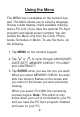 Using the Menu The MENU key is available on the numeric keypad. The Menu allows you to select a language, choose a date display, check available memory, start a PC-Link (if you have the optional PC Sync program) and adjust screen contrast. You can access the Menu only from the Clock, Phone books, Schedule or Memo. To use the menu, do the following. 1. Tap MENU on the numeric keypad. 2. Tap or to cycle through LANGUAGE?, DATE SET?, MEMORY CHECK?, PC-LINK? and CONTRAST?. 3.