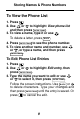 Storing Names & Phone Numbers To View the Phone List 1. Press . 2. Use or to highlight View phone list and then press ENTER/TRANS . 3. To view a name, type it or use . To delete a letter, press BACK . 4. Press ENTER/TRANS to see the phone number. 5. To view another name and number, use or , or type a name, and then press ENTER/TRANS . To Edit Phone List Entries 1. Press . 2. Use or to highlight Edit entry, then press ENTER/TRANS . 3.