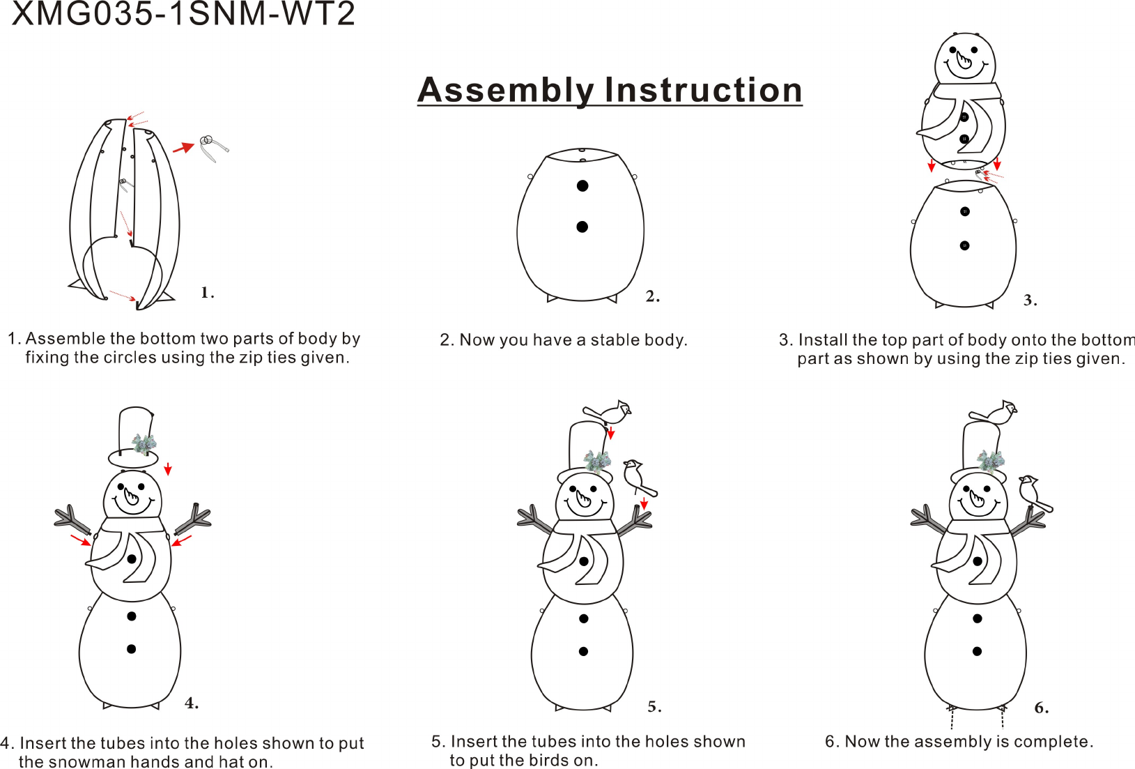 AMGO35-1TSNM-WTZ Assembly Instruction assemblies {he b&ttc_m two pa_rxs_sf quy by 2. Now you have stable body, 3. Install {he top part of body onto the bottom fixing the circles using the zip Hes govern. paras shown by urging the 2ip ties given, 6. 4. Insert the tubes into the holes shown fo put &, Insert the tubes into the holes shown 6. Now the assembly is committee, the snowman hands and halon. ot the birds on.