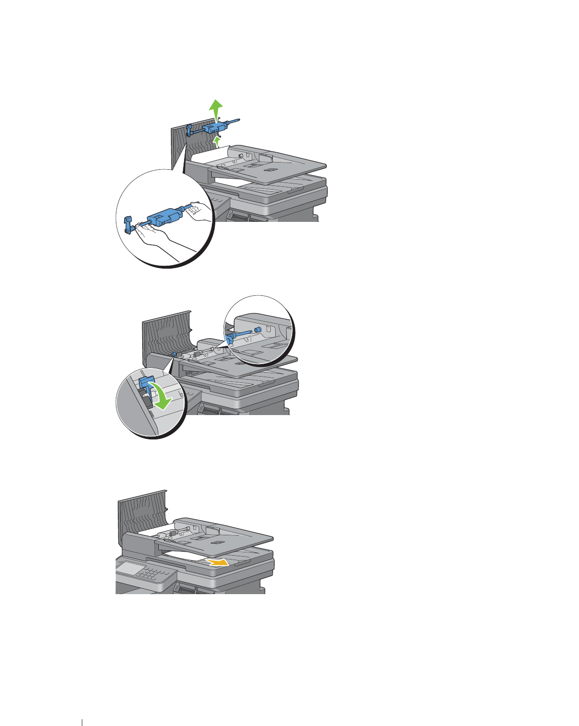 Remove the DADF feed roller assembly and remove the document by gently pulling it straight up.