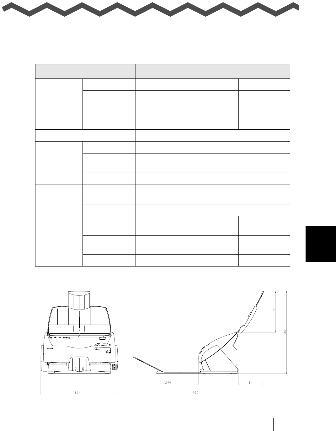 The following table summarizes the installation specifications of this scanner.