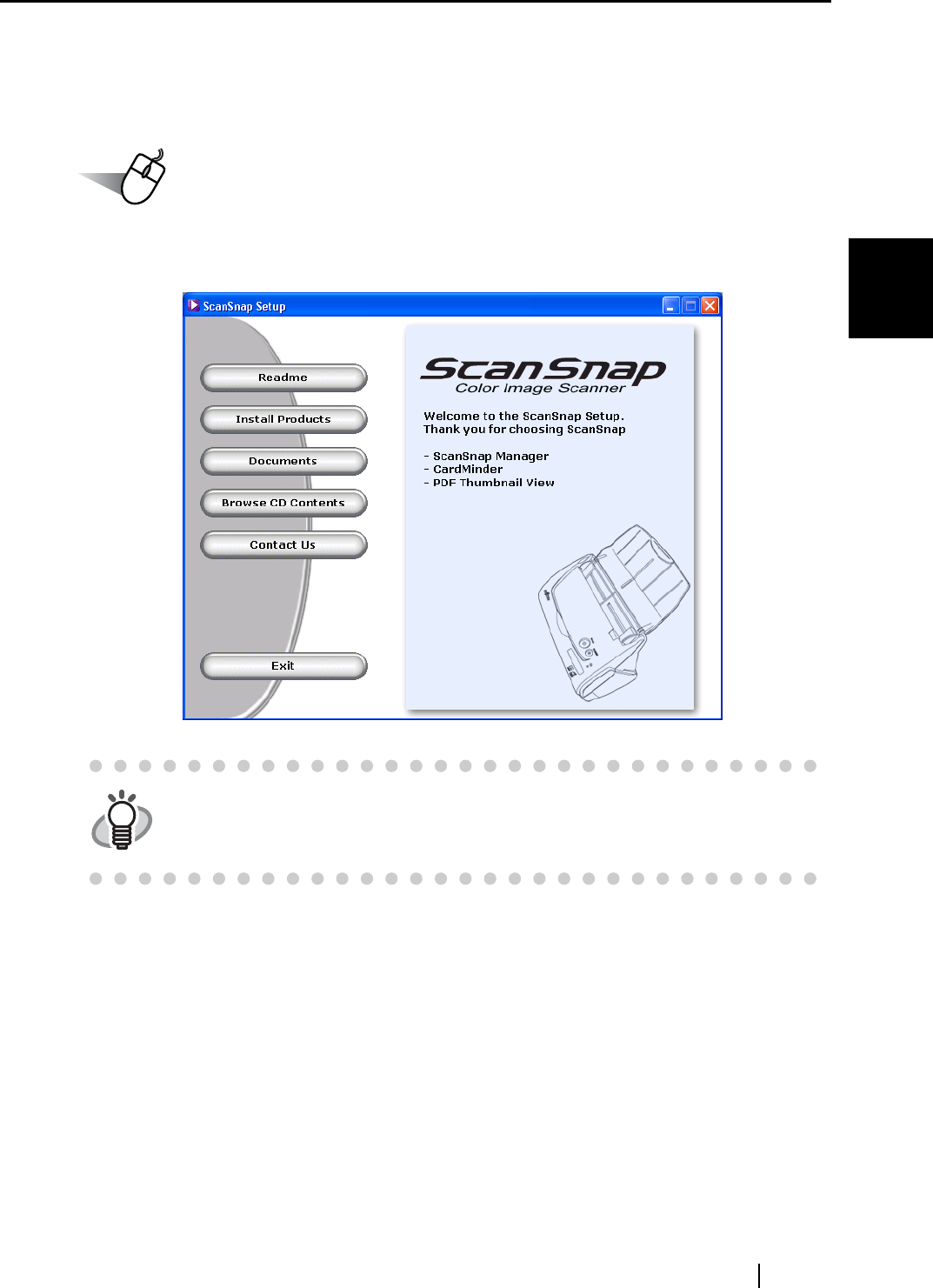 ⇒ The "ScanSnap Installer" starts up and the "ScanSnap Setup" dialog box is displayed.