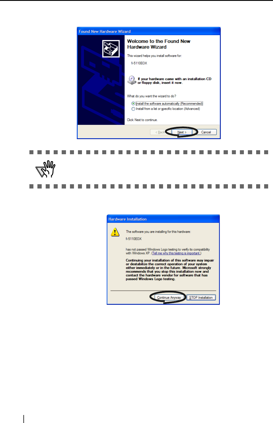 The "Hardware Installation" dialog box is displayed. Click the [Continue Anyway]