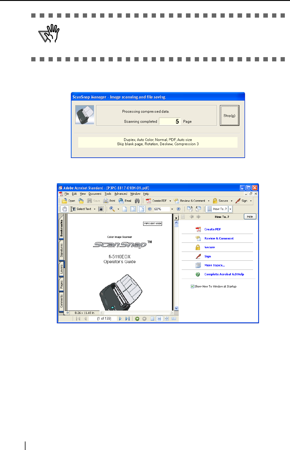 ⇒ The supplied application (Adobe Acrobat, etc.) is started up and the scanned image is dis-
