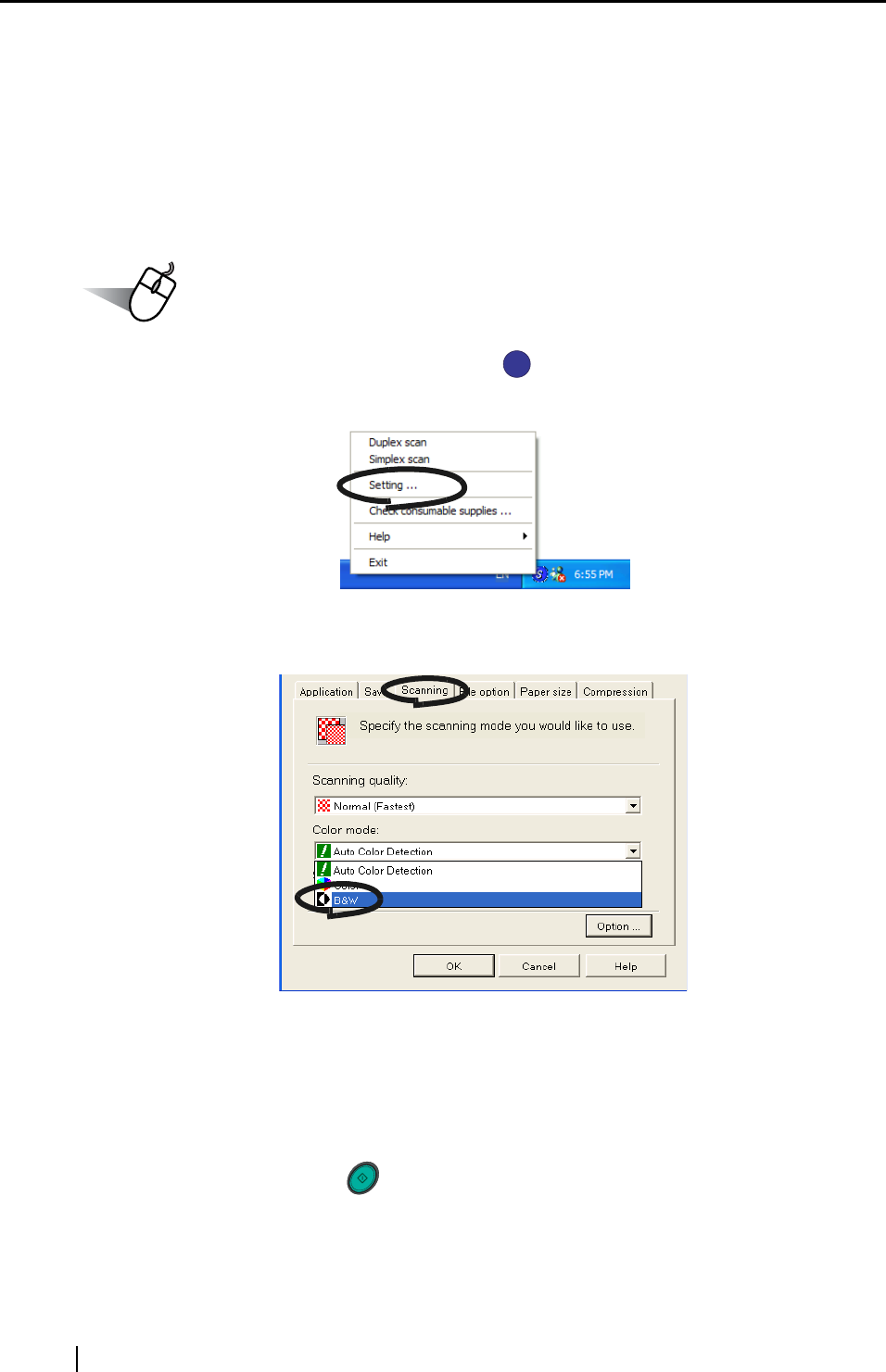 If you wish to scan colored document in black & white, change the settings following the proce-