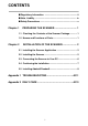 CONTENTS ■ Regulatory Information ........................................................ ii ■ Note, Liability ....................................................................... iv ■ Safety Precautions ................................................................ v Chapter 1 PREPARING THE SCANNER.................................. 1 1.1 Checking the Contents of the Scanner Package............. 1 1.2 Names and Functions of Parts..........................................