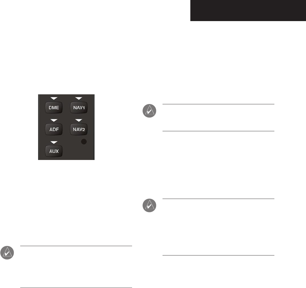 Pressing DME, ADF, AUX, NAV1, or NAV2 selects
