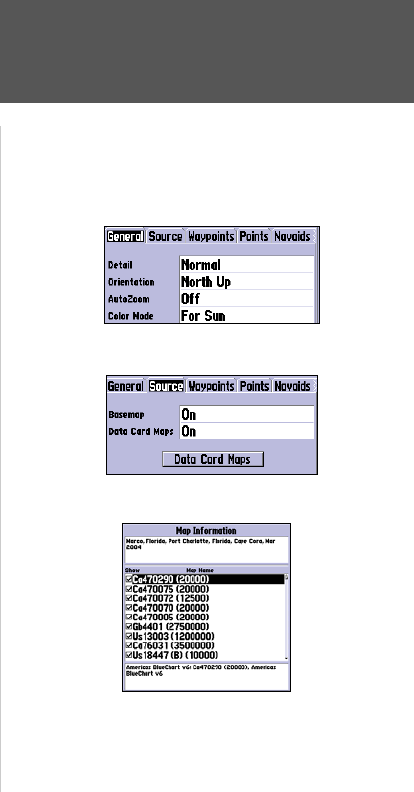 Data Card Maps— On/Off: turns all optional BlueChart/MapSource data loaded on the data