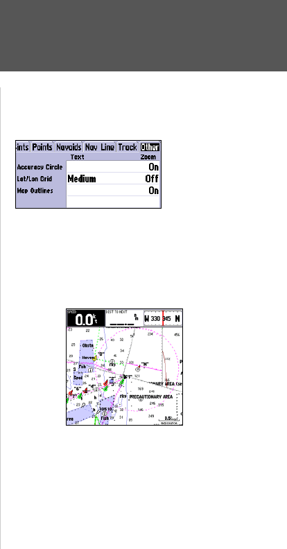 Map Outlines— On/Off: toggles the coverage boxes for BlueChart/MapSource data “On” and “Off”.