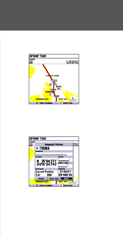 on a map page. You may also use the cursor to insert a new route point on a route leg, review the