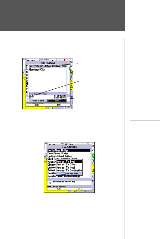 on a MapSource or BlueChart map, viewing a tide chart, viewing a list of maps on your data card,