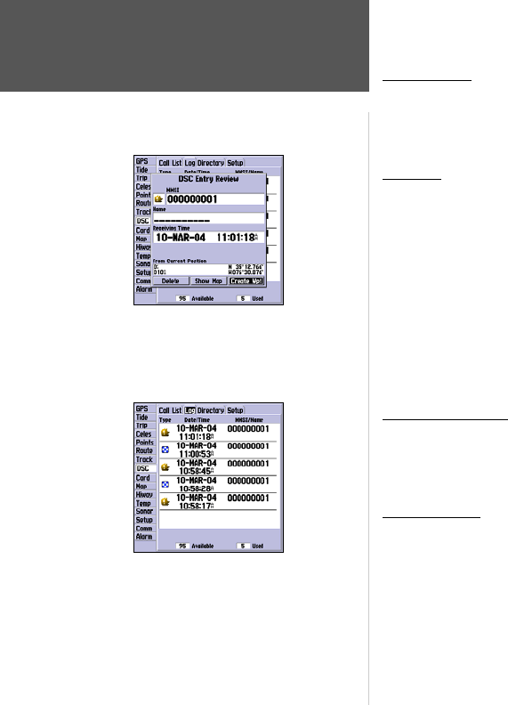 When DSC calls are received, they are automatically stored in the Log, with the latest call at the top.