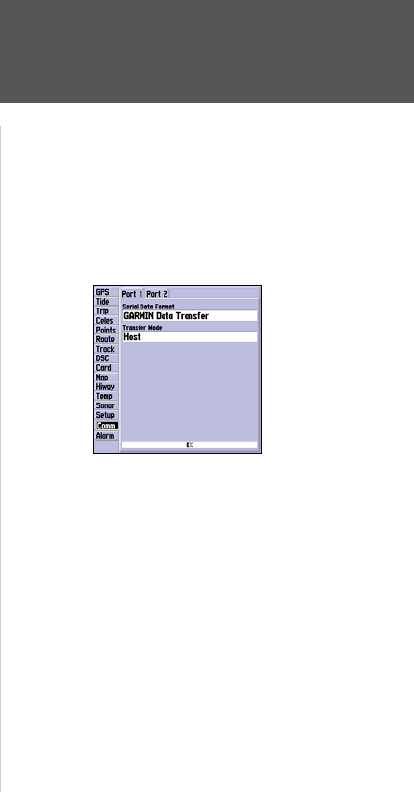 1. Use the ARROW KEYPAD to select ‘Garmin Data Transfer’ in the ‘Serial Data Format’ field.