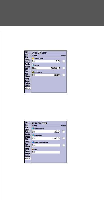 alarms to function. Fish Alarm will only function while using a Garmin GSD 20 Sonar Module.