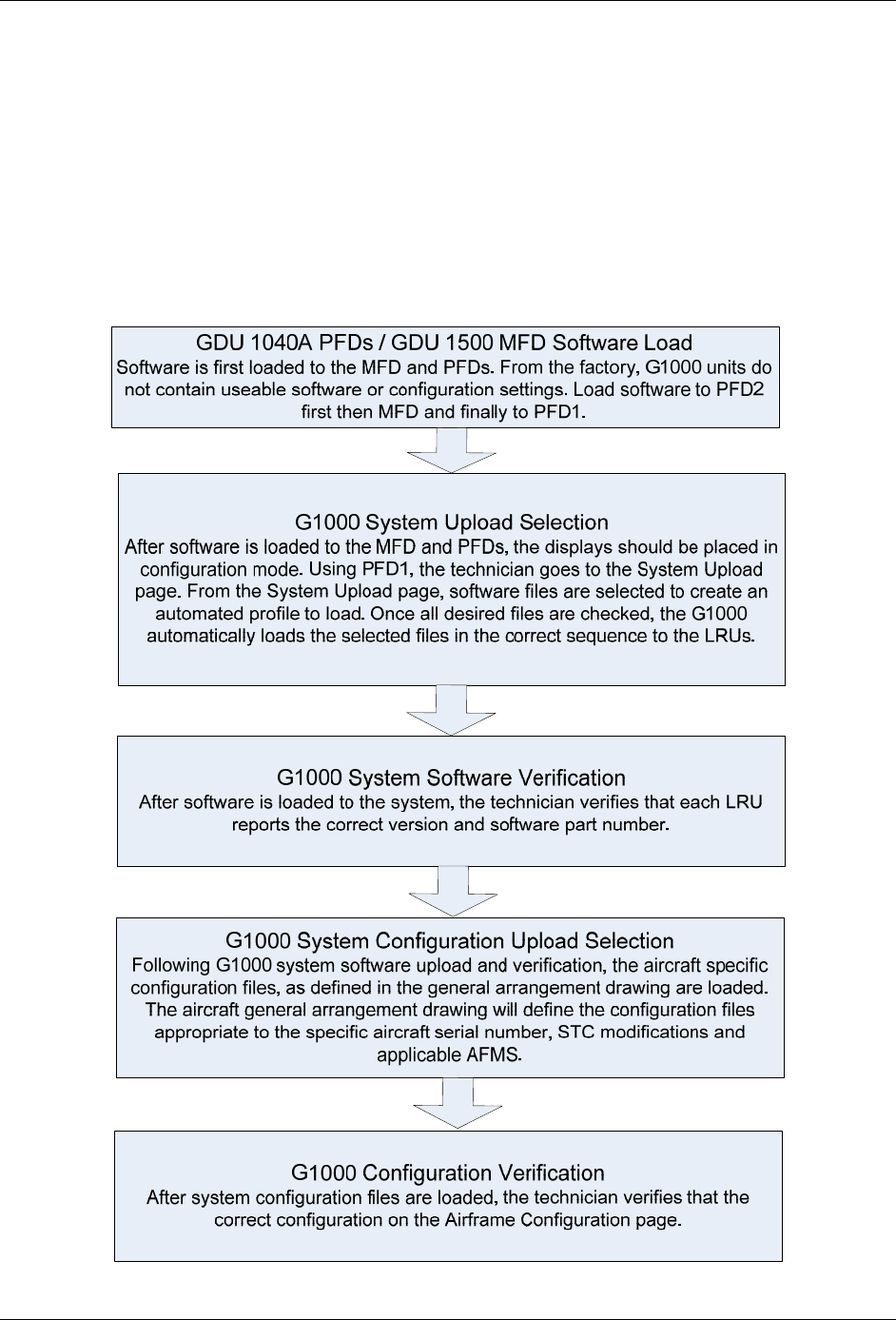 The following diagram depicts an overview of the software/configuration sequence for the G1000 system.