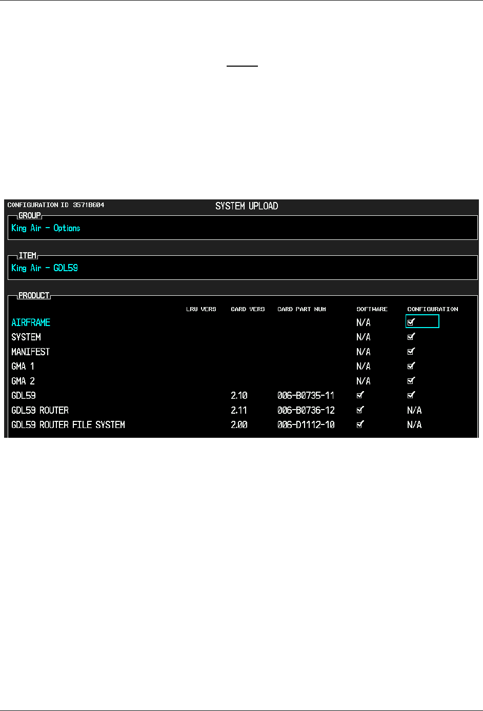 • Green “PASS” in Configuration column for AIRFRAME, SYSTEM, MANIFEST, GMA 1, GMA 2, and