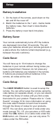 Setup Battery Installation 1. On the back of the remote, push down on the tab and lift the cover off. 2. Match the batteries to the + and - marks inside the battery case, then insert 2 AAA Alkaline batteries. 3. Press the battery cover back into place. Battery Saver Your remote automatically turns off if the buttons are depressed more than 30 seconds. This will save your batteries should your remote get stuck in a place where the buttons remain depressed (e.g., between the sofa cushions).