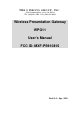 1. INTRODUCTION 1.1 Congratulation on Your Purchase of the Wireless Presentation Gateway The Wireless Presentation Gateway features state of the art technology that helps bring wireless capability to a conventional projector. You can now access the projector through a wireless network effortlessly without being constrained by the physical layout of a wired connection. The Wireless Presentation Gateway allows for multiple dynamic wireless connections from several PCs.