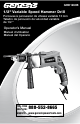 English 1/2" VARIABLE SPEED HAMMER DRILL Operator’s Manual SPECIFICATIONS • • • • • • • Model: ------------------------ GHD1260B Rated Power: ----------------- 120 V~/60 Hz, 6.0 Amp No Load Speed: -------------- 0-3,300 RPM & Reversible Hammer Action: -------------- 0-43,500 BMP Chuck Size: ------------------- 1/2” (13mm) Drilling Capacities: ------------ Steel: 1/2", Masonry: 5/8", Wood: 1-1/4" Net Weight: ------------------- 4.