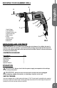 KNOWING YOUR HAMMER DRILL 8 2 6 English 5 3 4 7 1. Switch Trigger 2. Lock-ON Button 3. Forward/Reverse Lever 4. Speed Control Dial 5. Mode Selector 6. Chuck 7. Auxiliary Handle 8. Depth Gauge 9. Chuck Key 1 9 FIG 1 UNPACKING AND CONTENTS IMPORTANT: Due to modern mass production techniques, it is unlikely the tool is faulty or that a part is missing. If you find anything wrong, do not operate the tool until the parts have been replaced or the fault has been rectified.
