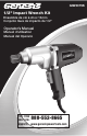 English 1/2" IMPACT WRENCH KIT Operator’s Manual SPECIFICATIONS • • • • • • • Model: ------------------------ GIW3075K Rated Power: ----------------- 120 V~/ 60Hz, 7.5Amp No-Load Speed: -------------- 0-2100 RPM Impacts Per Minute: ---------- 0-2700 IPM Maximum Torque: ------------ 220 ft-lbs Square Drive: ----------------- 1/2” (13mm) Net Weight: --------------------7 Lbs Includes: 4 Sockets (11/16”, 3/4", 13/16”, 7/8”), and Storage Case.