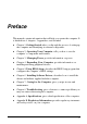 Preface This manual contains information that will help you operate the computer. It is divided into 8 chapters, 2 appendices, and an index. l Chapter 1, Getting Started, takes you through the process of setting up the computer and identifying its external components. l Chapter 2, Operating Your Computer, tells you how to use the computer’ s components and features. l Chapter 3, Managing Power, provides information on power.