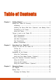 Table of Contents Chapter 1 Getting Started .......................................................................... 1 Getting the Tablet PC Running .......................................... 2 Unpacking .................................................................. 2 Installing the Micro-SIM Card (Optional) and Battery Pack. 3 Connecting to AC Power ............................................... 5 Using the Tether .........................................................