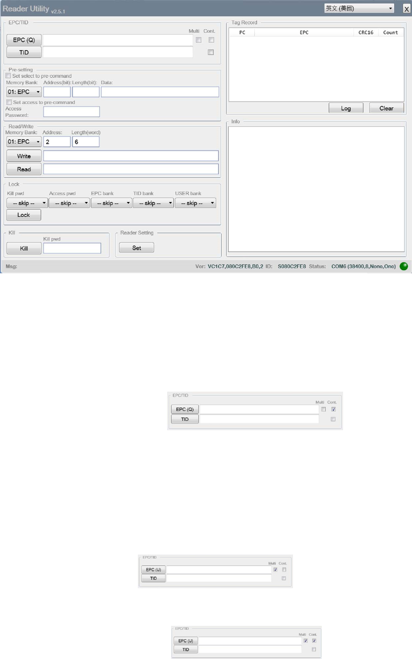 Read EPC data from single TAG. Check the box【EPC(Q)】. It can read TAG EPC