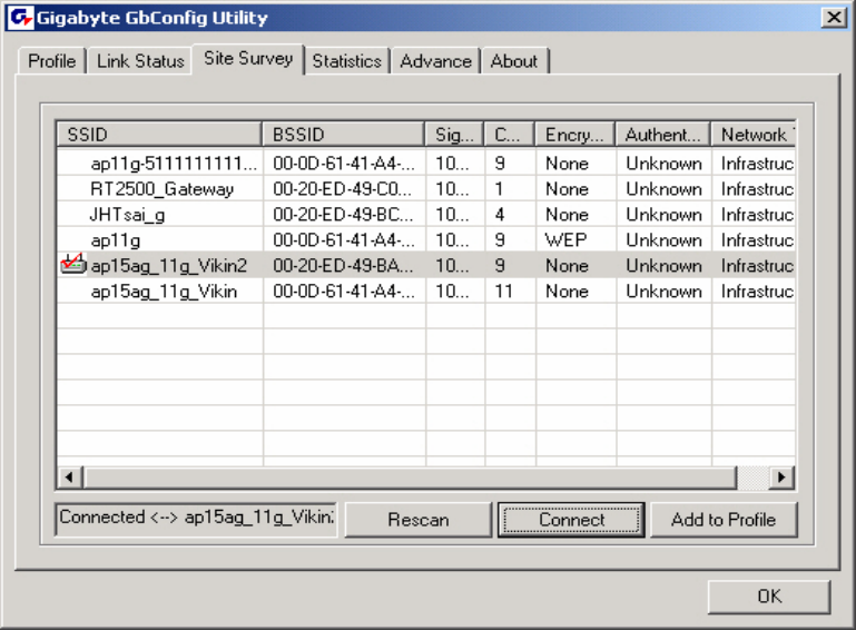 Setting “Site Survey” tab shows you the list of reachable access points and/or