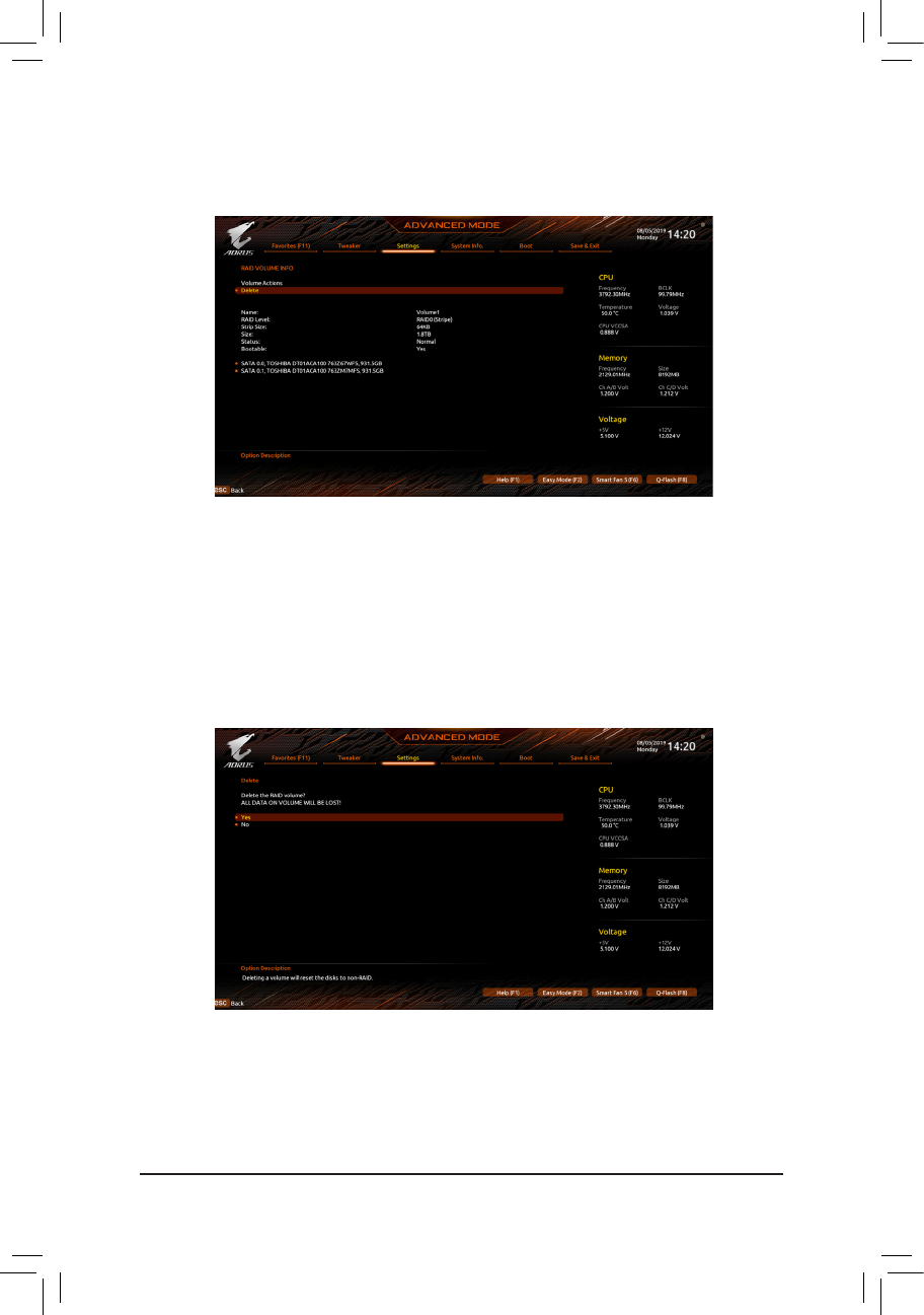 screen. After entering the RAID VOLUME INFO screen, press <Enter> on Delete to enter the Delete screen.