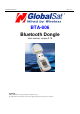 BTA-806 User Manual page 1 of 8 BTA-806 Bluetooth Dongle User manual, version 0.75 Copyright © 2005 GlobalSat Technology Corporation. All rights reserved The trademarks mentioned in this document are legally registered to their respective companies.