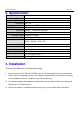 BTA-806 User Manual page 3 of 8 2. Specification Model Name BTA-806 Product Description Bluetooth USB dongle USB Interface 1.1 Certification FCC, CE Bluetooth Version Bluetooth v2.0 EDR RF Output Power Class 2 Frequency 2.4GHz ~ 2.4835GHz ISM band Spread Spectrum FHSS (Frequency Hopping Spread Spectrum) Operating Range 10 meters (32 feet) Sensitivity -80dBm @0.