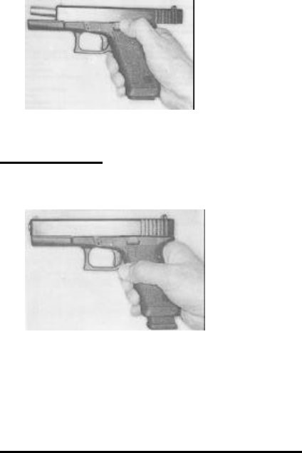 trigger finger of the shooting hand remains outside the trigger guard. The weapon is now