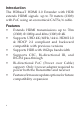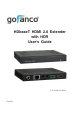 Introduction The HDbaseT HDMI 2.0 Extender with HDR extends HDMI signals up to 70 meters (230ft) with PoC using an economical CAT5e/6 cable. Features • • • • • • 4 Extends HDMI transmissions up to 70m (230ft) @ 1080p and 40m (130ft) @ 4K Supports UHD 4K/60Hz/4:4:4. HDMI 2.0 & HDCP 2.2 compliant and backward compatible with previous versions Supports HDR with 18Gbps bandwidth Supports CEC, Bi-directional IR, and RS-232 pass-through Bi-directional PoC (Power over Cable) support.