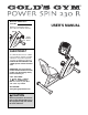 BEFORE YOU BEGIN Congratulations for selecting the new GOLD’S GYM® POWER SPIN 230 R exercise cycle. Cycling is one of the most effective exercises for increasing cardiovascular fitness, building endurance, and toning the body. The POWER SPIN 230 R exercise cycle offers a selection of features designed to let you enjoy this healthful exercise in the convenience and privacy of your home. of this manual. To help us assist you, note the product model number and serial number before contacting us.