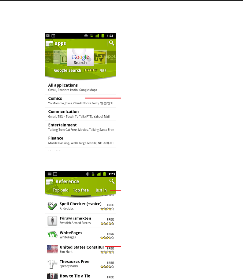 1 On the Android Market home page, touch a top-level category, such as Apps or