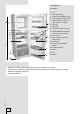 Description of the appliance A Refrigerator B Freezer 1 Fan* 2 Interior illumination 3 Fridge shelf (adjustable height) 4 Foldable egg tray (closed - 6 5 Crisp pan 6 Bottle rack* eggs, opened - 12 eggs) 7 Door lining shelf (options: deep, shallow; lid or without lid) 8 Bottle carrier with safety 9 Tube holder* holder* 10 Freezer shelf (adjustable height) 11 Freezer door shelf 12 Ice tray 13 Leg 14 Wheel* 149809 • Interior accessories of the appliance may vary according to the model.